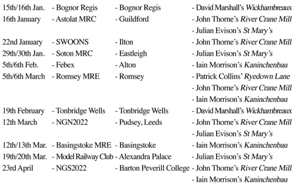 There are signs that the exhibition circuit is coming back to life as we all lean to live with COVID. This is where you can see group members layouts during 2022 – watch out for updates here as the year progresses: